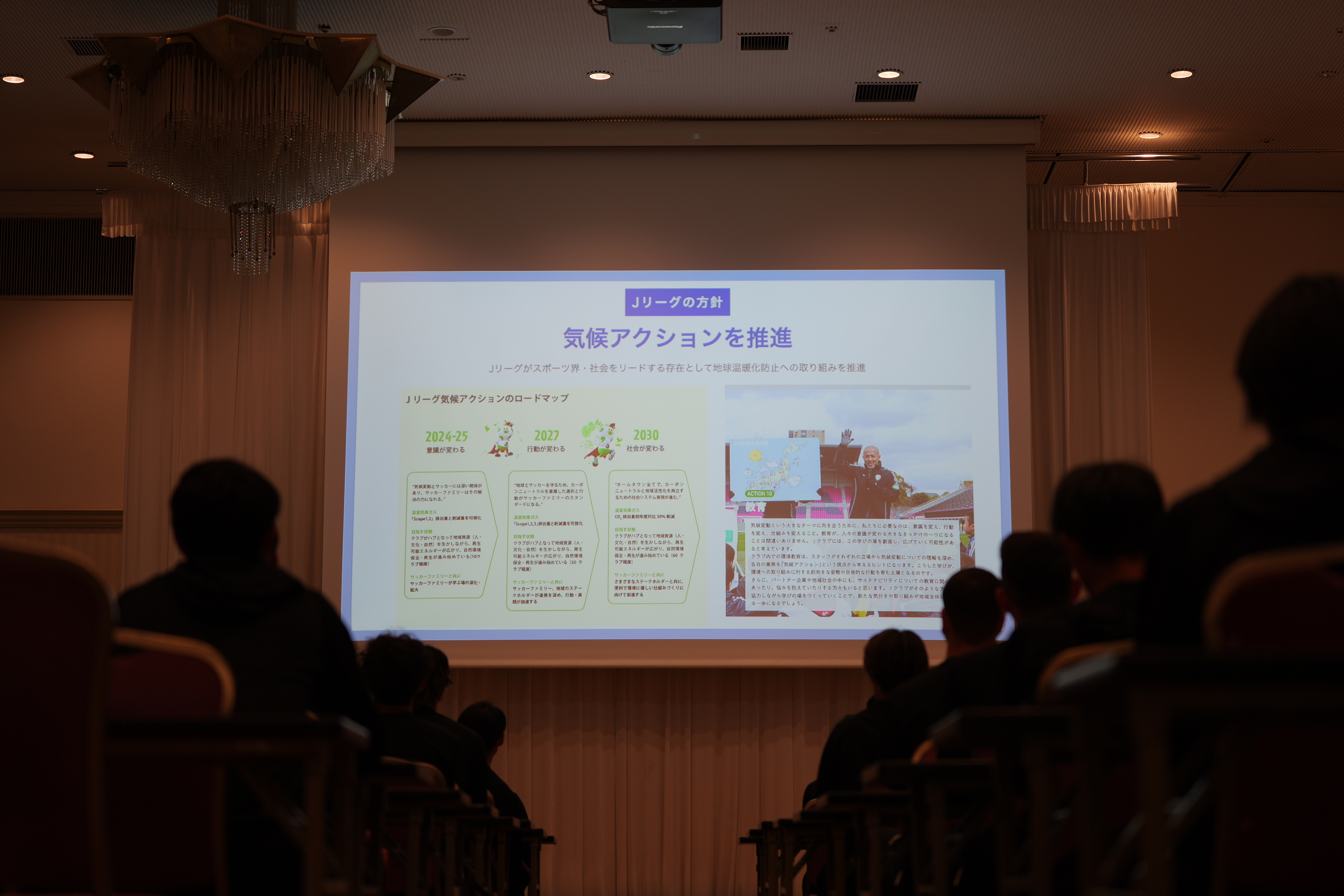 研修では、この取り組みの位置づけをはじめ、気候変動がスポーツ界やサッカーを取り巻く環境に及ぼしている影響、また海外クラブの事例などが紹介されました。
