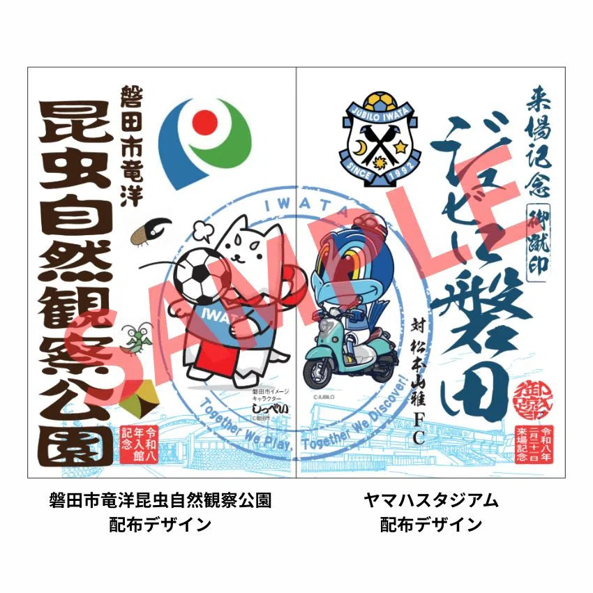 ヤマハスタジアム、および磐田市竜洋昆虫自然観察公園「こんちゅう館」にて、それぞれのデザインを施した御蹴印を配布いたします。
