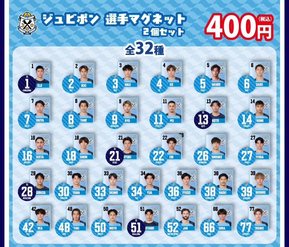 背番号&ユニフォームネームの丸形、顔写真入りの角形が2個セットになった、トップチームも愛用のマグネットです。角形マグネットには、「呼び馴染みのある名前がいい」とのチームの希望から、チーム内でのニックネームを採用しました。