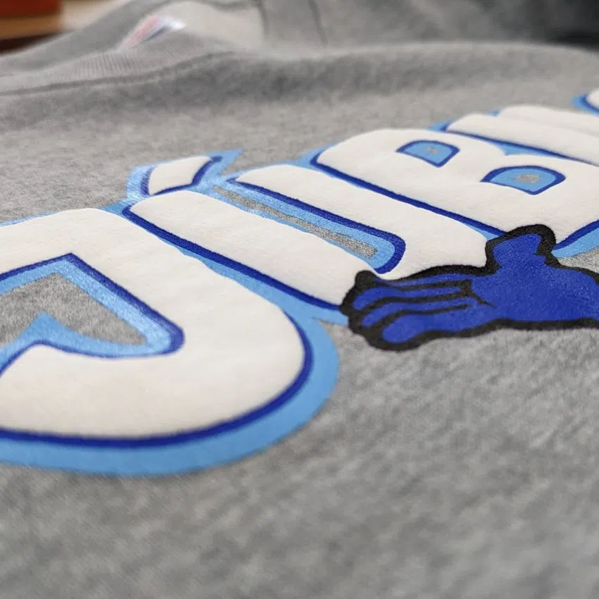 ベーシックなグレーのスウェットに、お馴染みのジュビロくんをプリント。「JÚBILO」の文字はぷっくりとふくらんだ発泡プリントになっています。