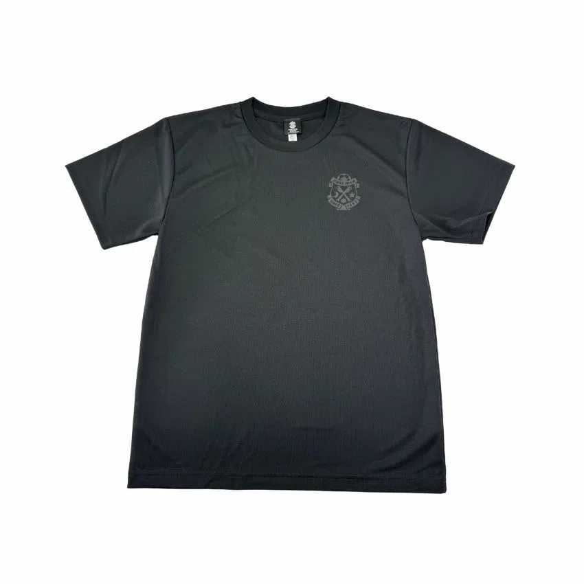 ボディと同色のブラックエンブレムがついたベーシックTシャツ。さらりとしたドライ素材で、ジムやランニングなど日常のスポーツシーンにも最適です。