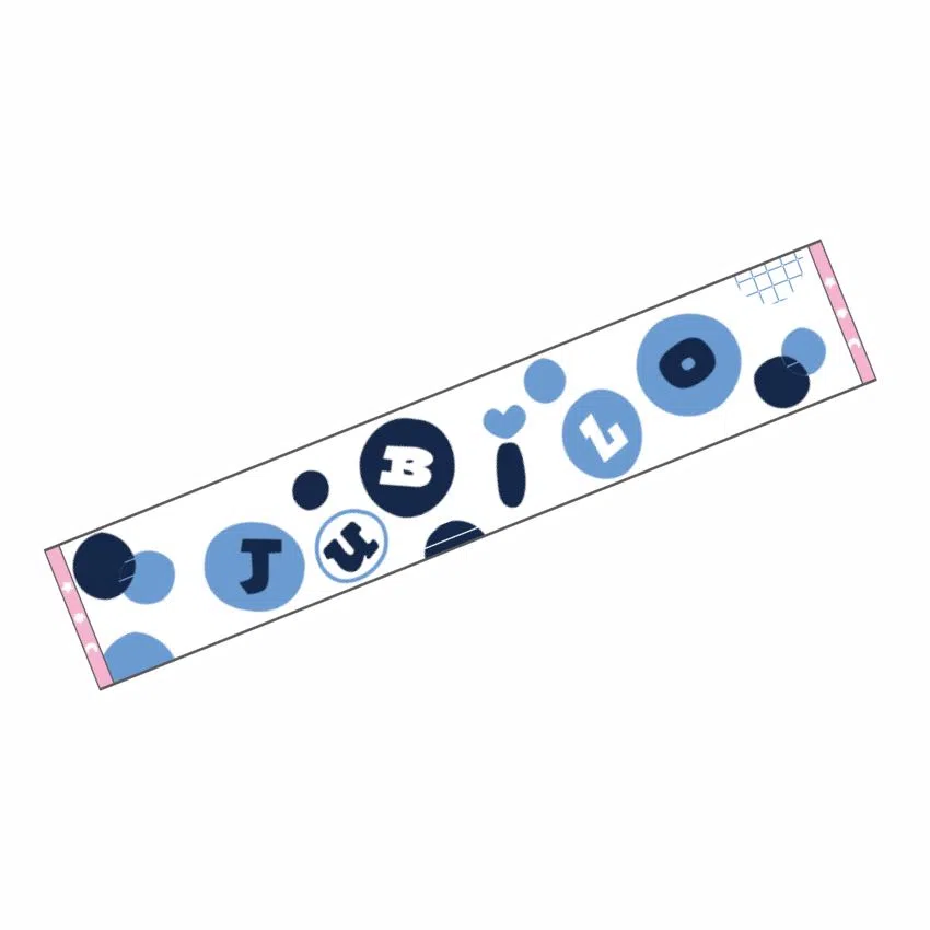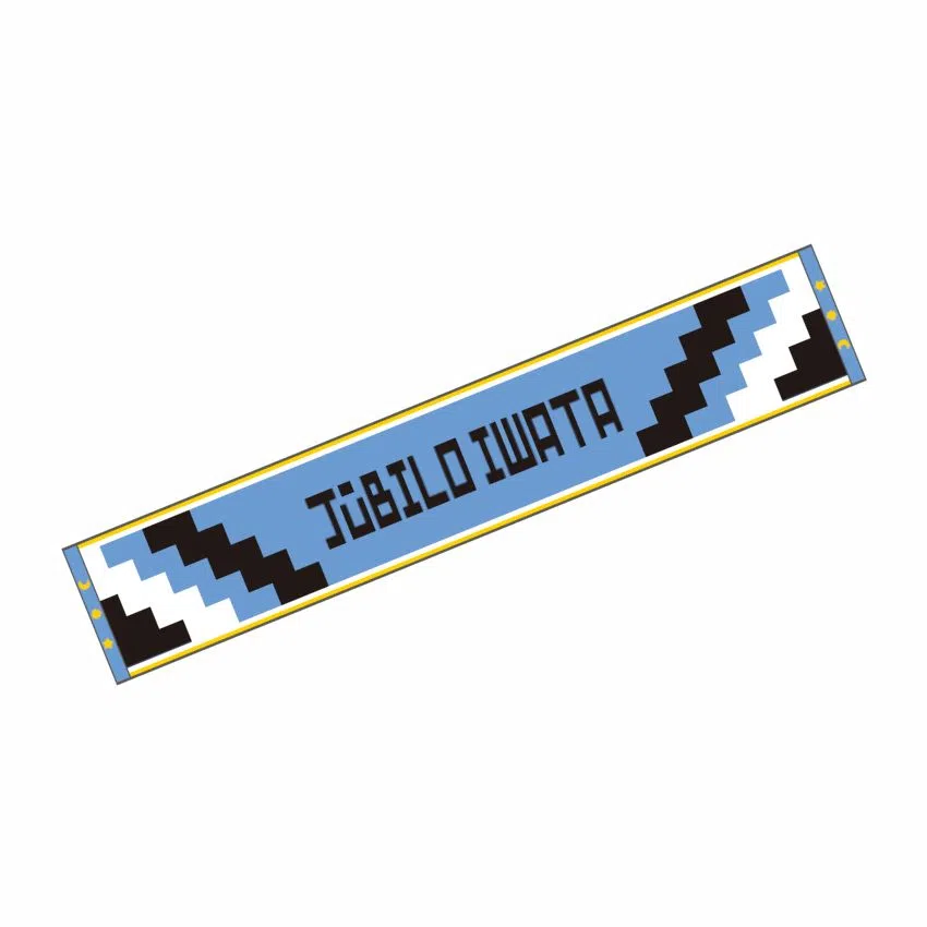 「JÚBILO IWATA」の文字をブロックゲームのような幾何学模様風にアレンジした新デザインのタオルマフラーです。