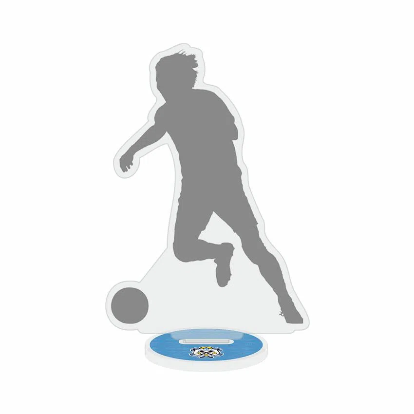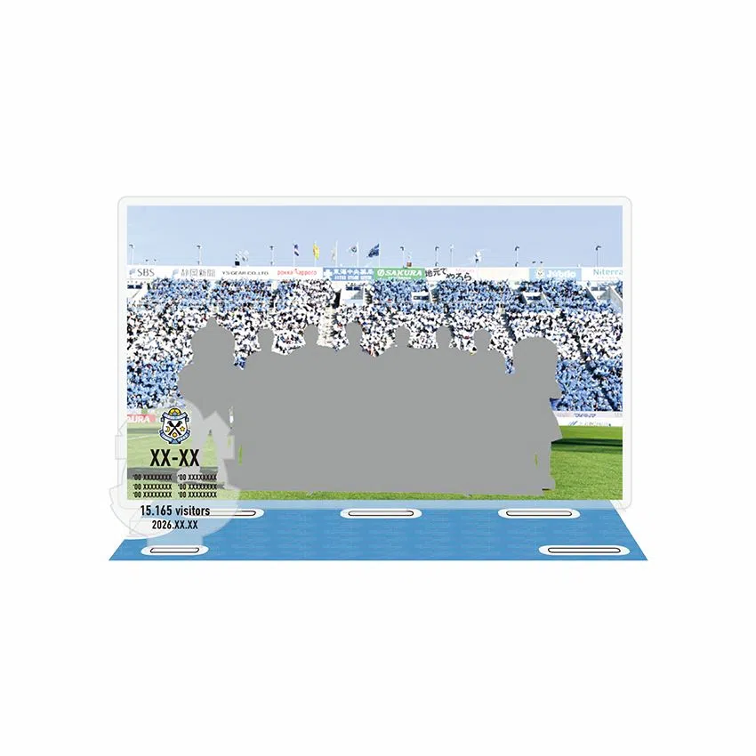 試合前集合写真を使用したアクリルスタンドです。エンブレム型のプレートにはスコア・得点者・来場者数が刻まれます。右側手前には、STAR of THE DAYのアクリルスタンド(別売り)をはめ込むことができます。